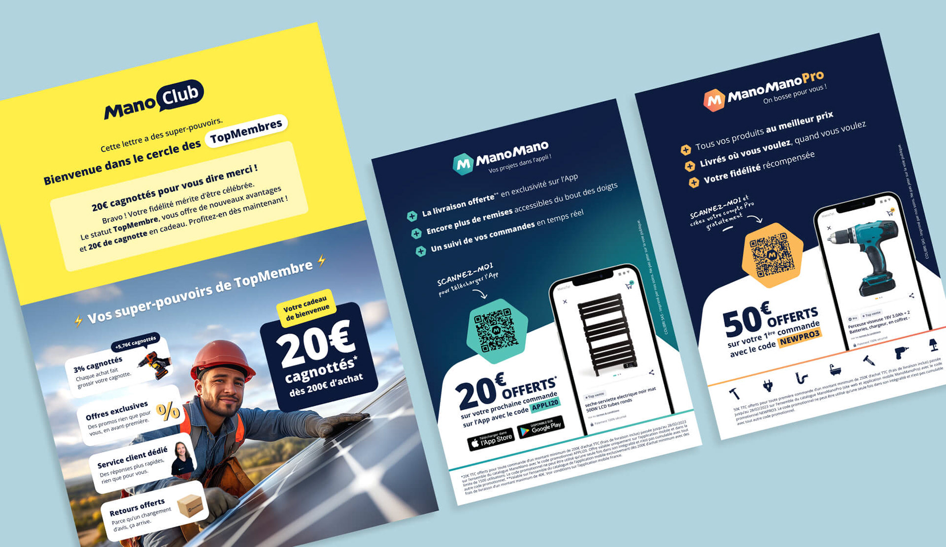 ManoMano - Page de pub A4 et flyers A5 (avec personnage généré par IA)